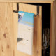 Serviette de cuisine avec une scène de plage tropicale idyllique. Eau cristalline bleu turquoise et plage de sable brun doux. Des feuilles de palmiers accrochés au-dessus. Un vieux bateau à rames en bois est installé sur la plage. Un paysage serein et paisible.