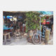 Décontracté, décontracté, à bicyclette, ce sont quelques-unes des choses qui composent le style de vie confortable représenté sur cette photo originale d'un vélo bleu marine penché sur un poteau devant un bar en plein air à Key West, en Floride. Un buisson vert verdoyant se trouve dans une baignoire, sous un auvent qui correspond à la couleur du vélo. L'intérieur sombre des lieux est rempli de tabourets de bar en bois, de parasols bleu d'eau et de cobalt sur les tables. Un bar bleu aqua devant complète la photo colorée.