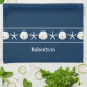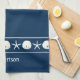 Parfait pour la décoration de la salle de bains côtière, cette serviette de cuisine personnalisée sur le thème de la plage dispose d'une rangée de dollars de sable blanc et d'étoiles de mer, avec le nom sous, sur un arrière - plan bleu marine. *Si vous avez besoin de modifications de conception ou si vous souhaitez plus de produits avec ce design ou d'autres couleurs, veuillez me contacter par Zazzle.