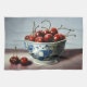 A classic blue-and-white porcelain bowl brims with glossy red cherries, each one painted with meticulous realism and soft natural light. The contrast between the cool ceramic and the rich, ripe fruit creates a sense of freshness, abundance, and timeless calm.