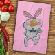 Cette serviette de cuisine est rose vif avec un joli dessin animé pouce vers le haut lapin portant une cravate arc-en-ciel noire avec des joues roses roses.