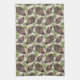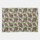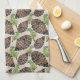 Cette serviette de cuisine comporte un motif répétitif de cônes de pin et de branches de pin.