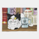 Un chat en tuxedo noir et blanc se réveille sur un plateau de cuisine avec ses livres de cuisine, tasse à café, sucre et crème.