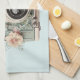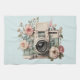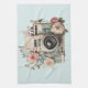 Kitchen towel with a vintage styled camera decorated with flowers. Pastel colors of pink, cream and green.