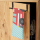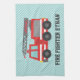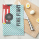 Une serviette de cuisine avec un joli camion de cheminée rouge avec des rayures blanches sur le côté et une échelle rétractable avec un tuyau. Bandes bleues inclinées pour arrière - plan. Palette de couleurs rouge, bleu, gris et blanc. Personnalisez avec le nom de l'enfant et appelez-les pompiers. Idéal pour les enfants, surtout les garçons, qui aiment les jouets de véhicules et les moteurs de tir !