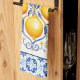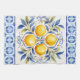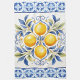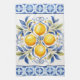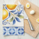 Serviettes de cuisine en carrelage méditerranéen et citrons. Beau bouquet de citron sur un fond de carrelage méditerranéen bleu et blanc. Vous pouvez ajouter du texte pour personnaliser.