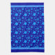 Pois et cercles grands et petits en bleu clair et foncé dans un motif rétro mignon sur une serviette de cuisine avec des bordures bleues sur un arrière - plan bleu foncé.