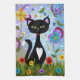 Mignonne chatte noire et blanche avec un coeur d'amour blanc sur la poitrine et des yeux vert vif assis dans une longue herbe verte. Elle est entourée de nombreuses jolies fleurs colorées. Des feuilles et de minuscules fleurs flottent autour d'elle et un papillon flotte autour de sa tête. L'art populaire abstrait numérique conçu par C.Katt.