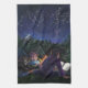 Starry Night art de Traci Van Wagoner imprimer, affiches, accessoires et cadeaux présente notre peinture originale de deux enfants et leur grand chien noir campant sous les étoiles en lisant un livre fantastique autour d'un feu de camp sur des chevaliers et des dragons. La magie de l'histoire tournoie dans le ciel étoilé pour montrer un chevalier et un dragon dans une éternelle danse nocturne des étoiles. Profitez d'un camp d'été en montagne.