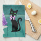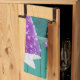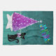This kitchen hand towel is has a wood floor and walls in a deep teal colour with a pink and silver Christmas tree on a white star shaped rug with a pretty black cat. Merry Christmas is colourful letters in on the wall.