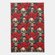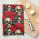 Parfait pour la maison gothique, cette serviette de cuisine est recouverte de crânes entourés de roses rouges et noirs. Beau design romantique et sombre.
