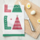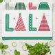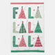 Une mignonne serviette de cuisine de vacances moderne et fantaisie avec les mots FA LA LA dans un style dessiné à la main. Les As sont représentés par des arbres de Noël.