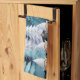 Christmas holiday kitchen towel featuring five elves in the snow.