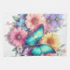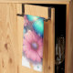 A kitchen towel with a beautiful illustration. A bouquet of flowers in pastel blue, green, purple and yellow. With a lovely blue butterfly hovering in front.
