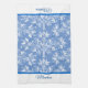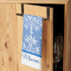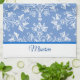 Une serviette de cuisine avec un motif damassé élégant de marguerites vintages et feuilles avec des rouleaux en blanc sur le bleu de cornflower, avec une bordure de blanc avec de l'espace pour votre nom en bleu.