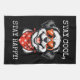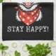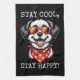 Un joyeux chien de bande dessinée avec un grand sourire, des lunettes de soleil orange et un bandana rouge imprimé de pattes se dresse contre un arrière - plan noir. Le texte en gras blanc dit "RESTE COOL, RESTE HEUREUX !" pour une ambiance amusante et stimulante.