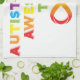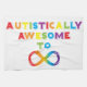 Design fait avec amour pour la Sensibilisation sur l'autisme. Les lettres arc-en-ciel forment l'expression "Autistiquement Awesome To Infinity" avec un symbole infinity.