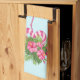Serviette de cuisine avec flamant de Noël à thème tropical portant un chapeau de santa rose. Sous ses pieds se trouve un bouquet de sucre de canne avec de jolies fleurs tropicales et des baies roses. Un bourgeon de saint sur sa poitrine.