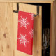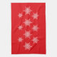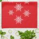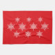 La serviette de cuisine de vacances est montrée avec un imprimé festif de flocons de neige. Customisez cet objet ou achetez tel quel.