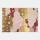 This artwork is a lavish, decorative exploration of a stylized sky, blending opulent gold leaf textures with a deep, dramatic crimson backdrop. It features whimsical, rounded clouds in shades of pastel pink and speckled gold, layered to create a sense of depth and luxury. From these clouds, delicate white lines descend like threads, carrying circular "raindrops" in white and soft pink, which give the piece a rhythmic, jewel-like quality. The overall aesthetic is one of ornate elegance, combining modern graphic shapes with a rich, classical color palette.