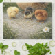 A cozy farmhouse kitchen towel featuring a mother hen watching over her fluffy chicks as they peck grain from the ground. One chick rests gently on the hen’s back while the others gather below, creating a warm and nurturing countryside scene. Surrounded by soft green grass and wildflowers, this illustration brings a peaceful, rustic charm to any kitchen.
