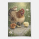 A cozy farmhouse kitchen towel featuring a mother hen watching over her fluffy chicks as they peck grain from the ground. One chick rests gently on the hen’s back while the others gather below, creating a warm and nurturing countryside scene. Surrounded by soft green grass and wildflowers, this illustration brings a peaceful, rustic charm to any kitchen.