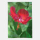 Sur cette image époustouflante, une fleur d'hibiscus rouge est mise en évidence contre un arrière - plan vert marbré.