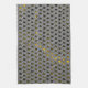 Image de courbes dorées ou jaunes sous les rectangles dont les couleurs vont du gris au plus foncé ou plus clair, donnant une perception de relief et de profondeur selon la position à regarder ou la perception personnelle. Les formes rectangulaires sont comme des pièces incorporées. Les rectangles de l'imprimé donnent une certaine apparence qu'ils sont des plaques grises collées.