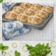 This elegant duck egg blue tea towel features a tray of golden hot cross buns held in floral pansy oven mitts, set against a soft heritage grid background. The inviting message “It’s Time – Hot Cross Buns” makes it perfect for Easter tables, spring kitchens, and thoughtful hostess gifting.