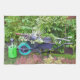 Tous les outils nécessaires pour travailler dans le jardin. Frappe à roues, arrosoir, pots, plantes et outils.