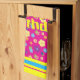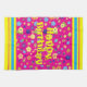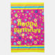 16" x 24" serviette de cuisine de coton de sergé avec une image de "joyeux anniversaire" dans de grandes lettres jaunes sur un arrière - plan des fleurs lunatiques sur le rose encadré par les rayures verticales jaunes, bleues et roses. Serviette assortie de tissu See, serviette de papier de cocktail, set de table de tissu, set de table de papier et dessous de verre. Voyez la collection entière de serviette de cuisine d'anniversaire dans la section de toiles de FOOD/BEV |.