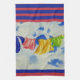 Sous un ciel bleu vif, une laverie aux couleurs vives a été suspendue pour sécher dans la brise. Cette aquarelle est intitulée, "Nice and Easy in the Breezy." Les couleurs du lavabo sont bleues, roses, jaunes et vertes, et le ciel bleu est partiellement nuageux. Cet art sur une serviette doit être accroché dans une cuisine ou une buanderie.