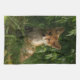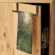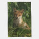 Une serviette de cuisine avec une photo représentant un mignon petit renard à fourrure rouge et blanche. Entouré de feuilles et d'herbes verdoyants.