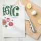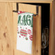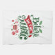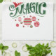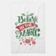 Serviette de cuisine avec illustration cool. Texte dit Croire à la magie en lettres fantaisistes. Décoré de boules de noël.
