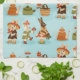 Fun cartoon animal print on a light blue background features cows, pigs, and bunnies gardening with tools and flowers. Cheerful and playful vibe.