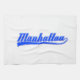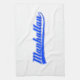 Manhattan, New York City, écrit avec un swash (queue). Polices en blanc et bleu. Conception de texte originale.