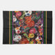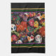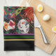 Serviette de cuisine noire de 16" x 24" avec une image de masques colorés Mardi Gras ornés de plumes vives et de parties scintillant sur le noir. Bordures de bandes violettes, vertes et dorées. Voir serviettes assorties, serviettes en papier, set de table en tissu, set de table en papier et dessous de verre. Voir toute la collection de serviettes de cuisine Mardi Gras dans le FOOD/BEV| Section Linens.