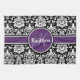 Elégant, féminin, floral damassé arrière - plan motif en noir et blanc avec un cadre de étiquette de nom personnalisable en violet pour votre lettre initiale monogramme et nom personnalisé.