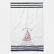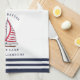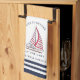 Personnalisez ce design nautique monogrammé avec votre nom de famille ou un autre texte pour créer une serviette de cuisine blanche, bleu marine et rouge unique avec une illustration de voilier et la vie est meilleure au lac dire. C'est une idée cadeau élégante pour les propriétaires de maisons de lac pour Noël, une fête de ménage ou d'autres occasions.