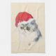 Noël de chat, une illustration mignonne comportant un chat persan utilisant le casquette de Père Noël. Couleurs principales : beige, blanc, rouge, gris, noir et jaune. Le dessin original a été fait avec les crayons colorés par le © E.D. Siffert d'artiste.