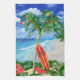 Bonnes fêtes des plages sablonneuses chaudes de votre plage tropicale préférée d'île. Palmier décoré des ornements et des lumières de Noël, avec une rétro planche de surf se penchant contre l'arbre de Noël.