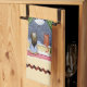 Une serviette de cuisine avec un tableau d'aquarelle blanc. Un jeune enfant en pyjama et son chatte chatte regardant devant leur fenêtre le soir de Noël. Le Père Noël et ses rennes volent le ciel nocturne sous forme de silhouette avec une grande lune illuminant leur chemin.
