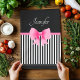 Serviette de thé en noir et blanc de la cuisine avec un joli arc rose ceint et ruban sur un motif à rayures noir et blanc et imprimé de nom blanc personnalisé.