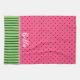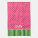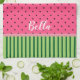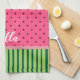 Cute pastèque serviette de cuisine avec des rayures vertes sur le fond et rose avec des pois noirs sur le dessus. Un ruban faux rose sépare les deux motifs.