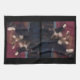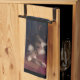 Les pattes molles sont la première chose que vous voyez sur la photo originale d'un chat calico sur cette serviette de cuisine. Le chat, principalement noir et marron, est allongé sur une couverture rouge foncé et marron contre un arrière - plan foncé, et ses pattes blanches se détachent, étalées devant elle avec au centre deux croisées l'une sur l'autre. La fourrure blanche sur sa poitrine monte jusqu'au visage, les yeux fixés sur quelque chose à travers la pièce.