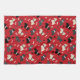 Chiens écossais mignons, noirs, gris et roux, avec des arcs, avec des empreintes et des os de chien sur un arrière - plan rouge.
