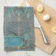 Personalized kitchen towel with a designer Art Deco Fountain tile hand drawn pattern by Anne Londez in dove gray and teal colors. Perfect for a new home hostess gift!