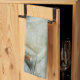 Une serviette de cuisine avec une photo sereine représentant un beau cheval blanc avec un petit oiseau reposant sur le cou. Une chute de neige magique en hiver donne à l'image une qualité mystique merveilleuse.