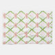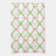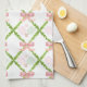 Cette serviette de cuisine à pickleball dispose d'un motif de treillis vert avec des arcs roses et deux pagaies en vichy pickleball quadrillé à l'intérieur de la treillis. Les couleurs utilisées sont le vert, le rose pâle et le bronzage.