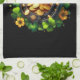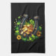 Serviette de cuisine avec une image sur le thème de la Saint Patrick. Un fer à cheval noir et or assis dans un lit de trèfle vert avec des pièces d'or brillantes.